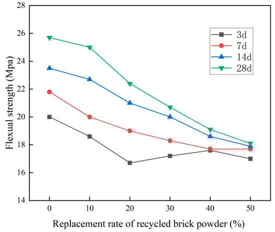 From Figure 9 and Table 5, it is evident that at the age of 28 d, the flexural strength of the UHPC, after having replaced the cement with recycled brick micropowder, was lower than that in the benchmark group. When the replacement rate was 10%, 20%, 30%, 40% and 50%, the 28 d flexural strength of the UHPC was 25.0 MPa, 22.4 MPa, 20.7 MPa, 19.1 MPa and 18.1 MPa, respectively, which was 2.7%, 12.8%, 19.5%, 25.7% and 29.6% lower, respectively, than that in the benchmark group. With the increase in age, the flexural strength of the recycled brick micropowder UHPC showed an increasing trend as a whole. The larger the replacement rate, the less obvious the trend. The flexural strength of the UHPC with a 50% replacement rate was almost the same at each age. At 7d, 14d and 28 d, the flexural strength of the UHPC in the benchmark group, which had a 0% replacement rate, was 21.8 MPa, 23.5 MPa and 25.7 MPa, respectively, which was 9.0%, 17.5% and 28.5% higher, respectively, than that at 3d. When the substitution rate was 50%, the 28 d flexural strength of the recycled brick micropowder UHPC was 18.1 MPa, which was only 6.5% higher than that at 3d. When the replacement rate was 10%, the flexural performance of the recycled micropowder UHPC was the best. It is worth noting that the 28 d flexural strength of each group of the recycled brick micropowder UHPC specimens was greater than 15 MPa, which meets the provisions for UHPC flexural strength in the T/CCPA 7-2018 (T/CBMF 37) [34]. As the replacement rate of the recycled brick powder increased, the flexural strength of the material showed a downward trend. The older the age, the more significant the downward trend. [38,39].