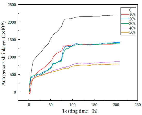 In the present study, when the replacement rate increased from 0% to 10%, the autogenous shrinkage of the UHPC decreased obviously. At 168 h (7d), the shrinkage rate of the R1 group was 37.5% lower than that in the benchmark group. When the replacement rate increased from 10% to 30%, the autogenous shrinkage development law of the UHPC was relatively close. After the shrinkage was basically stable, the shrinkage rate of R1, R2 and R3 was not much different. The 168 h shrinkage rate of R2 and R3 was reduced by 36.6% and 37.2%, respectively, compared with the benchmark group. When the replacement rate was 40–50%, the shrinkage rate of the UHPC continued to decrease, and the 168 h-autogenous shrinkage rate of R4 and R5 was 61.2% and 63.7% lower, respectively, than that in the benchmark group. The results show that the autogenous shrinkage of each group of specimens decreased with the increase in the replacement rate of brick powder. This was because the addition of the RBP reduced the cement composition, thereby reducing the autogenous shrinkage value of the UHPC [28,43].