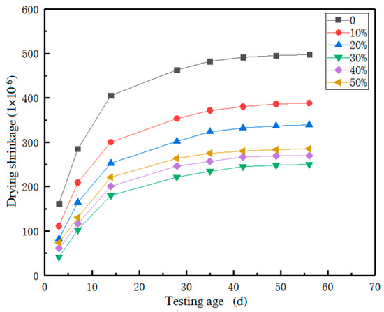 Figure 12 shows that the drying shrinkage of each group of test pieces developed rapidly before the age of 14 days, and slowly after the age of 14 days. At the age of 42 days, the drying shrinkage of the UHPC was basically stable. With the increase in the replacement rate of the recycled brick powder, the drying shrinkage rate of each group decreased continuously. Compared with the baseline group, the 56d drying shrinkage rate of the R1 to R5 groups decreased by 21.9%, 31.8%, 49.7%, 42.7% and 45.6%, respectively. The drying shrinkage of the material decreased significantly after the recycled brick powder replaced the cement. The loss of water and the increase in recycled brick powder reduced the drying shrinkage of the materials [44].
