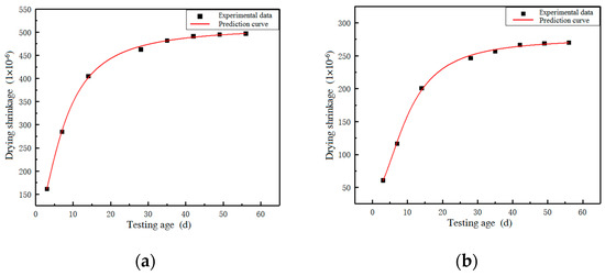 A comparison between the drying shrinkage test results and prediction curve. (a) Baseline group; (b) 40% substitution rate group.