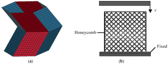 Numerical simulation models of origami honeycombs were established based on Patran, and LS-DYNA was used as an analytical solver to analyze the energy absorption characteristics of the origami honeycomb structure under compressive loads in different directions. The finite element model of a unit cell is shown in Figure 4a. We selected the elastoplastic constitutive model and applied it as plastic kinematics (MAT3). The selection of properties was homogenous and the Belytschko Tsay shell element was used. IsoMesh was used to mesh the geometry, and we used quadrilateral mesh with edge length of 0.1L. The schematic of the finite element model is illustrated in Figure 4b. In order to simulate the mechanical behavior of the origami honeycomb structure under compression load, the honeycomb was placed on a completely fixed rigid plate, and a moving rigid plate moved downward to crush the honeycomb. No constraints were imposed on the honeycomb. All of the degrees of freedom of the fixed rigid plate were fixed, but only the translational degrees of freedom of the moving plate in the vertical direction were not restricted. Self-contact was established between the external surfaces of the honeycomb structure to prevent penetration caused by the surface of the model, and surface-to-surface contact was defined between the honeycomb and each rigid plate. Friction was taken into consideration: the dynamic friction coefficient between the rigid plate and the honeycomb structure was set to 0.17, and the friction coefficient between the honeycomb cell walls was 0.1. To ensure the accuracy of simulation results, the sampling points for simulation were set to 1000.