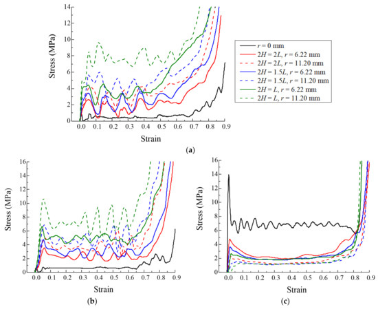 Seven finite element models were analyzed to investigate the energy absorption characteristics of the origami honeycomb in the in-plane and out-of-plane directions, including one conventional honeycomb and six origami honeycombs with different H and values. The model parameters and simulation results are listed in Table 1. The stress–strain curves of different models are depicted in Figure 5. In the in-plane direction, as shown in Figure 5a,b, the stress on the conventional honeycomb decreases rapidly after reaching the initial peak stress value, and the mean stress along the y-coordinate and x-coordinate directions are only 0.488 and 0.582 MPa, respectively. However, the stress value of the origami honeycomb always maintains a high value, accompanied by a series of crests and troughs. When H remains unchanged, a larger r will result in a higher mean stress. This is consistent with the conclusions of previous studies [44]. On the other hand, when r remains unchanged, the mean stress increases as H decreases. A smaller H means that there are more origami units in the out-of-plane direction. Therefore, the energy absorption caused by the bending of the plastic hinge increases, and the mean stress of the origami honeycomb is improved. It can be seen that when r = 11.20 mm and H = L, the strengths in the two in-plane directions of the origami honeycomb are 5.88 and 5.92 times that of the conventional honeycomb, respectively. Furthermore, when r = 11.20 mm and 2H = L, the strengths in the two in-plane directions of the origami honeycomb are 15.14 times and 11.92 times higher than those of the conventional honeycomb, respectively. In the out-of-plane direction, as depicted in Figure 5c, the creases of the origami honeycomb form multiple preset plastic hinges in the out-of-plane direction, thereby reducing the strength of the honeycomb in this direction. When H remains unchanged, a larger r will result in a lower mean stress. This is also consistent with the conclusions of previous studies [44]. On the other hand, when r remains unchanged, the mean stress decreases as H decreases. In conclusion, a decrease in H leads to an enhancement in the in-plane strength of the origami honeycomb. Therefore, this paper will focus on the 2H = L origami honeycombs.