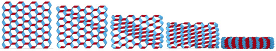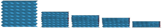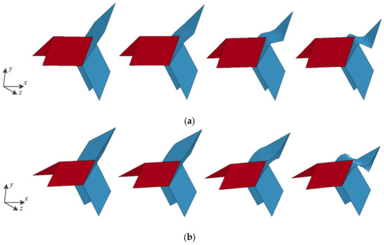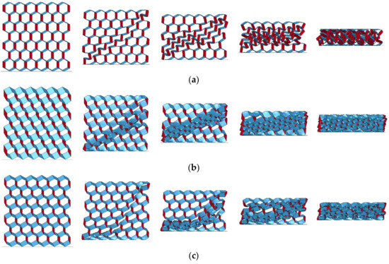 The deformation process of the origami honeycomb under the compression load along the x-coordinate is illustrated in Figure 7. Similar to the y-coordinate, in the x-coordinate crushing process, the origami honeycomb structure also exhibits a layered crushing deformation pattern. However, the origami honeycombs with different folding parameters produce different deformation patterns, namely, symmetrical deformation pattern (Figure 7a), one-sided deformation pattern (Figure 7b), and compound deformation pattern (Figure 7c).