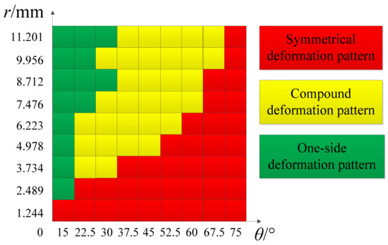 In order to accurately analyze the relationship between the deformation mode along the x-coordinate and the geometric parameters of the origami honeycomb, the number of models has been expanded, and the folding parameters are and , respectively. Figure 9 shows the distribution of the deformation modes with changes in the folding parameters. When is relatively large, it is easy to produce a symmetrical deformation mode, and when remains unchanged, a lower is more likely to produce a symmetrical deformation mode. When is relatively small, the one-sided deformation mode is likely to occur, and when remains unchanged, a higher is more likely to produce a one-sided deformation mode. The origami honeycombs in the middle distribution zone are more likely to produce compound deformation modes.
