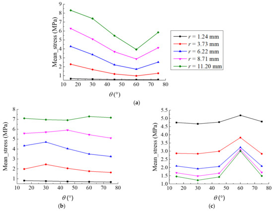 The approximate solutions of the mean stress calculated using the surrogate models are listed in Table 2. Apparently, the surrogate model established by the RSM has errors. It is necessary to use the root mean square error (RMSE), the coefficient of multiple determination (), and the adjusted coefficient of multiple determination () to evaluate the accuracy of the RSM model [48,49].