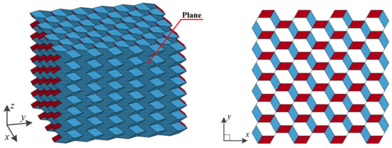 The origami honeycomb is folded from the conventional honeycomb, as illustrated in Figure 1, and the arris edges of the conventional honeycomb are folded in accordance with the Miura origami pattern. Hence, the origami honeycomb depicted in Figure 2b can be regarded as a combination of multiple oblique hexagonal prisms. A pair of symmetrical hexagonal prisms can be regarded as a unit cell. x and y are the in-plane coordinates, where the x-coordinate is parallel to one side of the hexagon. z is the out-of-plane coordinate, which is perpendicular to the plane where the hexagon lies. , , and are the number of unit cells in the x, y, and z coordinates, respectively.