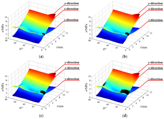 The mean stress under the compression of the origami honeycomb is shown in Figure 11. In the y-coordinate direction, as shown in Figure 11a, when is fixed, the mean stress increases as increases. In contrast, when is fixed and increases, the mean stress first decreases and then increases beyond . In the x-coordinate direction, as shown in Figure 11b, the mean stress appears at “local high points” in the model of the compound deformation mode. In the z-coordinate direction, has a significant influence on the mean stress, as shown in Figure 11c; when is fixed, the mean stress increases as decreases. In contrast, when is fixed, the mean stress does not change significantly when changes, but there exists a point of high value at .