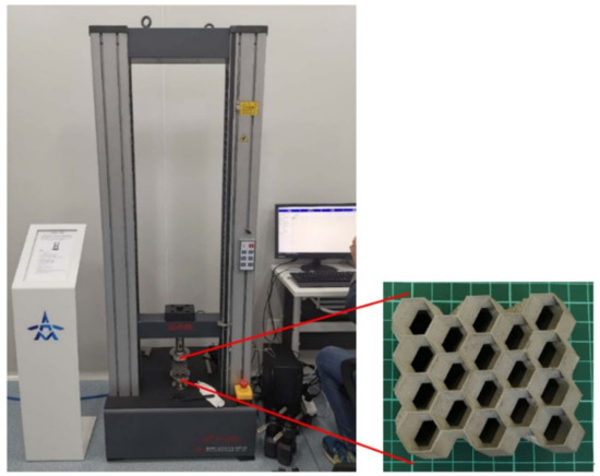 To verify the accuracy of the simulation model in this study and the effectiveness of the isotropic design method for the origami honeycomb, the universal impact testing apparatus was used to perform the compression test on the origami honeycomb specimen, as shown in Figure 17. Three origami honeycombs satisfying 0.1 ≤ k < 0.2, 0.2 ≤ k < 0.3 and k ≥ 0.3 were randomly selected using the approximate isotropic evaluation system in Section 4. The specific parameters of the three honeycombs used to make the experimental specimens are listed in Table 5. In the previous work, we fabricated origami honeycombs made of aluminum alloys and conducted compression tests. The experimental results show that the aluminum alloy origami honeycomb has great brittleness, and its buffer performance fluctuates greatly. Therefore, in this paper, stainless steel was used to make origami honeycomb specimens. Additionally, all specimens were fabricated using a 3D printer. The stainless steel material has mechanical properties with Young’s modulus E = 139.5 GPa, density ρ = 7980 kg/m3, Poisson’s ratio v = 0.33, and yielding stress σ = 456 MPa.