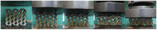 Cellular structures are considered to be the most promising structures for energy absorption and structural protection owing to their low density, low stiffness, controllable deformation, and mature processing technology [1,2,3,4,5,6,7]. Cellular structures have excellent characteristics within a certain range or in a specific direction, whereas in other directions, they inevitably demonstrate limitations in their mechanical properties. For example, owing to the particularity of honeycomb structures, their in-plane strength is merely 1/20 of their out-of-plane strength [4,8,9,10]. Therefore, when honeycomb structures are used as energy-absorbing structures, they typically absorb energy only in the out-of-plane direction of the cells. To improve the specific energy absorption, most honeycomb structural designs are focused on improving the buckling deformation capacity [11,12,13,14,15]; however, this does not solve the problem of the significant difference between the strengths in the in-plane and out-of-plane directions.