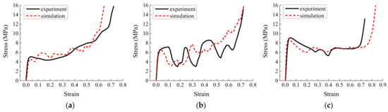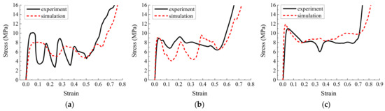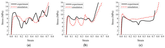 In addition to the compression experiment on the specimen (Figure 18), we simulated the origami honeycomb with the same geometric structure and mechanical properties. The comparison of the simulation and experimental results is depicted in Figure 19, Figure 20 and Figure 21. It can be observed from the experimental results that the stress curves are similar to those in the simulation in terms of both magnitude and trend. The mean stress values for each model are listed in Table 6. It can be seen that the experimental mean stress of Specimen 1 in the y, x, and z directions is 7.34 MPa, 5.74 MPa, and 8.25 MPa, respectively. Therefore, according to Equation (10), the approximate isotropic coefficient of Specimen 1 can be calculated as 0.3. The simulated mean stress of Specimen 1 in the y, x, and z directions is 6.41 MPa, 6.21 MPa, and 8.92 MPa, respectively. The maximum relative error between simulation results and experimental results is −14.51%. Similarly, the experimental mean stress of Specimen 2 in three directions is 7.41 Mpa, 8.26 Mpa, and 7.13 MPa, and the approximate isotropic coefficient is 0.14. The simulated mean stress is 6.63 MPa, 7.78 MPa, and 8.32 MPa. The maximum relative error is 14.30%. Finally, the experimental mean stress of Specimen 3 in three directions is 6.01 MPa, 5.71 MPa, and 6.96 MPa, and the approximate isotropic coefficient is 0.18. The simulated mean stress is 6.1 MPa, 5.96 MPa, and 6.85 MPa. The maximum relative error is 4.19%. In summary, the experimental results verify the accuracy of the simulation and the effectiveness of the design method of approximately isotropic origami honeycomb.