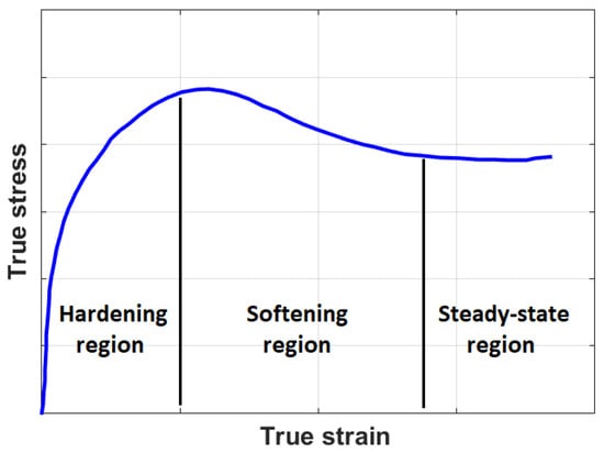 A common flow stress curve under hot deformation is shown in Figure 1. The figure shows that the flow stress behavior under hot deformation includes three regions: (i) the hardening region, in which a rapid increase in the flow stress up to the peak can be observed due to work hardening and DRV; (ii) the softening region, in which stress sharply falls due to the combined effect of DRV and DRX; and (iii) the steady-state region, in which steady stress overcomes as a result of the equilibrium between hardening and softening [16,98].