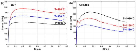 The flow behaviors of the B07 [99] and GH5188 [100] superalloys at elevated temperatures and a strain rate of 0.1 s−1 are shown in Figure 2a and Figure 2b, respectively. As can be seen, the flow stress is extremely sensitive to temperature and passes the three regions that are defined in Figure 1. The obtained stress–strain curves for the B07 and GH5188 superalloys under hot deformation show that both alloys are greatly affected by hot working parameters, i.e., strain, strain rate, and temperature, in which stress decreases as the temperature increases and the strain rate decreases. Similarly, the same flow stress behavior under hot deformation has been reported for many different alloys, such as iron [101,102,103], titanium [104,105,106], aluminum [107,108,109,110], copper [111,112], nickel [113,114,115], and magnesium [116,117] alloys.