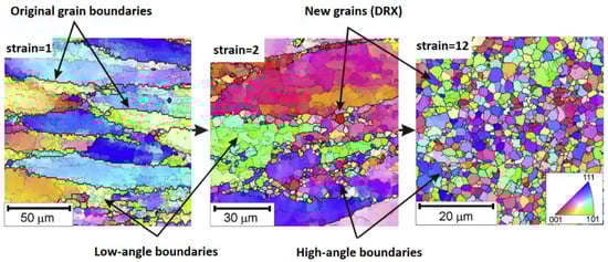 As a result of DRX, dislocation is formed due to the release of stored elastic energy in the hardening region, which results in homogeneous sub-grains. As the strain increases, the misorientations between sub-grains increase, and the sub-grains are turned into fine grains [118,119,120,121,122]. Figure 3 shows the formation of new fine grains in AA1421 aluminum alloy due to DRX, in which aluminum alloy was processed using equal channel angular extrusion (ECAP) repeatedly to a strain of 12 at 673 K.