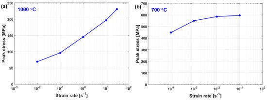 Figure 4 shows the peak stress vs. strain rate for Fe-26Mn-6.2Al-0.05C steel alloy at 1000 °C [124] (cf. Figure 4a) and Duplex cast steel alloy at 700 °C [125] (cf. Figure 4b). The figure shows that, as the strain rate increases, the peak stress increases for both alloys. Similar findings can be found in [126,127,128,129,130]. As a matter of fact, this increase is attributed to the speedy rate of strain hardening, especially in the initial stage. Thus, the generation and multiplication of dislocations are accompanied by higher strain rates, in which high stresses are required due to dislocation interactions [131,132,133]. On the contrary, there is not enough time for DRV and DRX as restoration mechanisms [134,135].