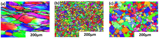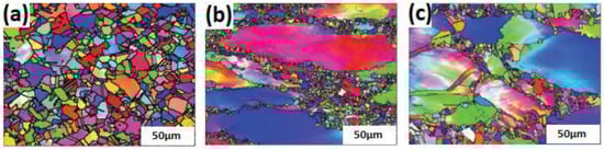 Inverse pole figure maps of microstructures of new nickel-based superalloy at 0.01 s−1 for (a) 950 °C, (b) 1050 °C, and (c) 1150 °C [153].