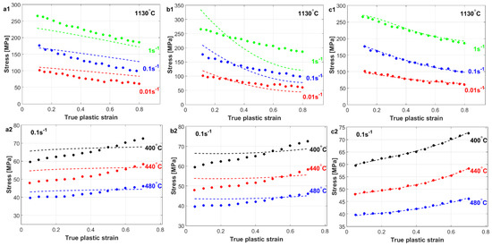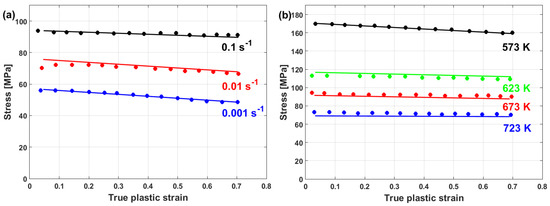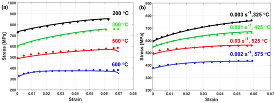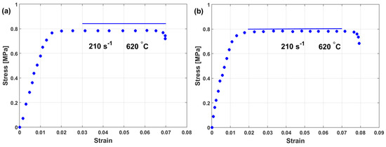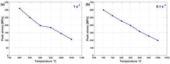 Figure 6 shows peak stress vs. temperature for Fe-26Mn-6.2Al-0.05C steel alloy [124] (Figure 6a) and Duplex cast steel alloy [125] (Figure 6b) at 1 s−1 and 0.1 s−1, respectively. As can be seen, the peak stress decreases as the temperature increases. Similar findings can be found in [144,145,146,147,148]. At high temperatures and low strain rates, the flow stress decreases due to the slow rate of both DRV and DRX [149,150], in which the interaction and annihilation of the dislocations can be guided by adequate thermal energy in plenty of time [151,152].