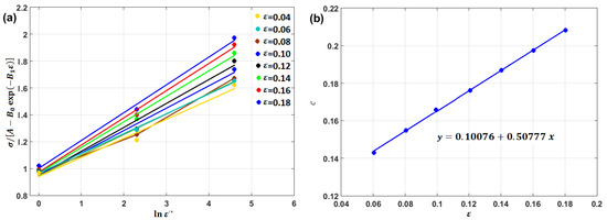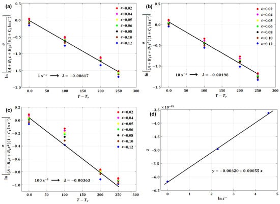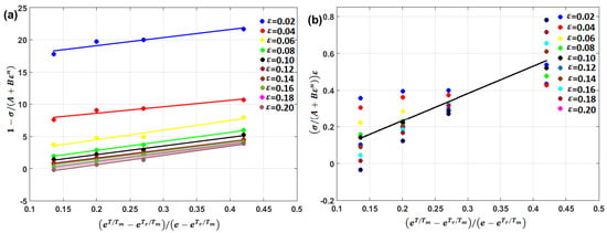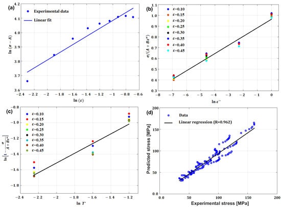 By plotting vs. at different strain rate and temperature values, different values for (slope of the equation; cf. Figure 14a–c) are obtained, which can be plotted vs. , in which the value of is the intercept and the value of is the slope (Figure 14d).