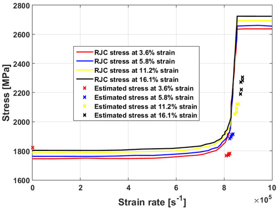 Predicted stresses obtained using the modified JC (RJC) model that was presented by Rule and Jones [68] compared to yield strength in the quasi-static experiment and anticipated from a one-dimensional Taylor specimen model at very high strain rates.