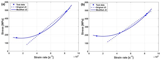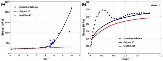 Rule and Jones [68] presented a modification for the original JC model to capture the sudden rise in strength at very high strain rates (over 104 s−1). This modified JC model was applied to OFHC copper, 7075-T6 aluminum, wrought iron, and high-strength steel. The modified JC model that was introduced by Rule and Jones [68] can be expressed as