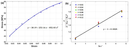 where and are material constants. Constants and are determined in the same way that was explained for the original JC model (see Section 3.1). At the reference temperature, after performing some rearrangements, Equation (10) turns into