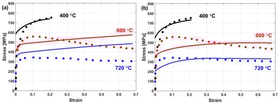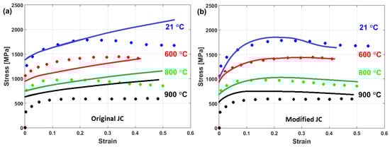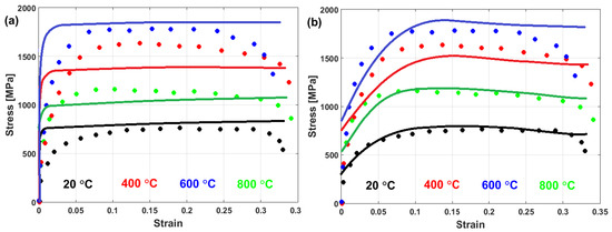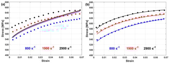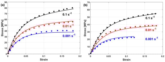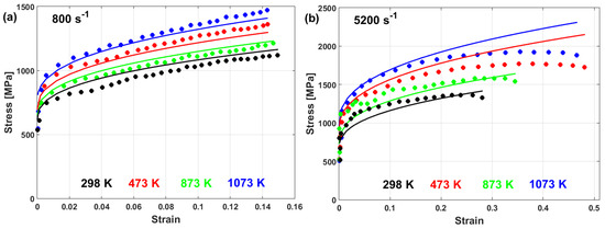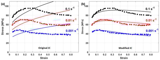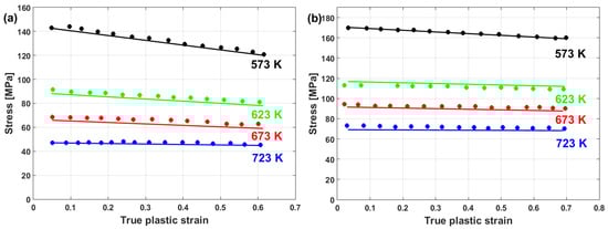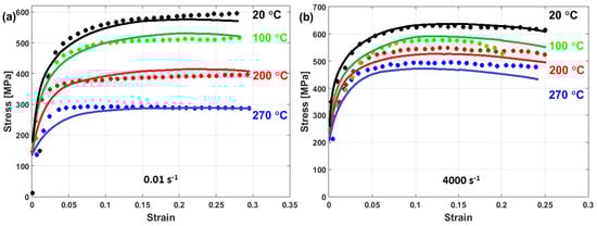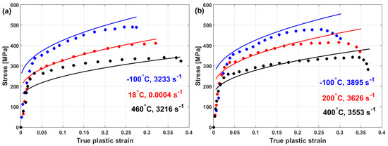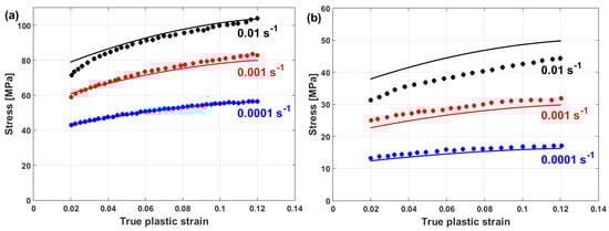 Experimental stresses (markers) compared to predicted stresses (solid lines) obtained by the modified JC that was presented by Hou Q. Y. et al. [74] for Mg–10Gd–2Y–0.5Zr alloy with the following dimensions: (a) Փ 10 mm × 5 mm and (b) Փ 10 mm × 4 mm.