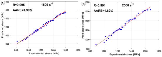 Experimental stresses are compared to predicted stresses that were obtained by the modified JC model that was introduced by Lin et al. [73] for typical high-strength alloy steel at different strain rates and different temperatures, as shown in Figure 15. The figure shows that the predicted stresses agree very well with the experimental stresses, with a maximum relative error (RE) of 5.15%. The modified JC model that was introduced by Lin et al. [73] has been used with many different alloys [170,171,172,173,174], with accurate predictions and inaccurate predictions for other alloys [61,96,175,176,177].
