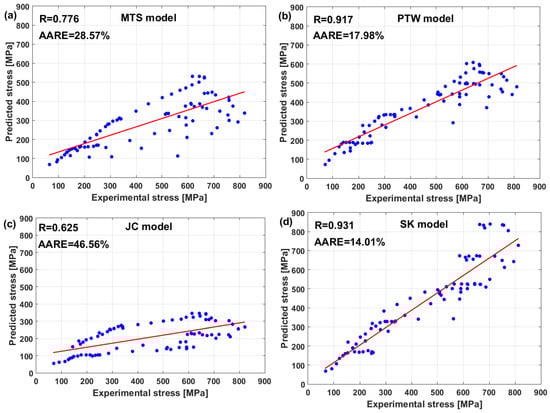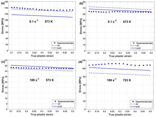 A good agreement between experimental stresses and predicted stresses obtained by the modified JC that was presented by Hou Q. Y. et al. [74] for Mg–10Gd–2Y–0.5Zr alloy is achieved (cf. Figure 16).