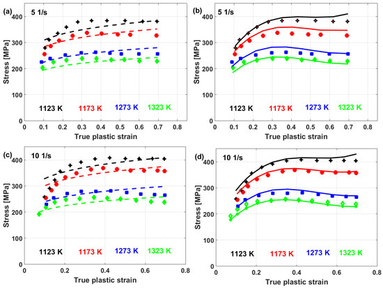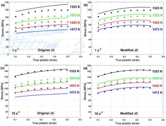 Experimental stresses (markers) compared to predicted stresses (solid lines) obtained by the modified JC model that was presented by Lin et al. [73] for typical high-strength alloy steel at (a) 1123 K and (b) 1323 K.