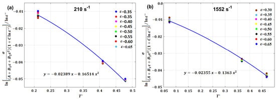 where constants and are determined as was explained for the original JC model (see Section 3.1). At different strain rate values, after performing some rearrangements, Equation (20) can be written as