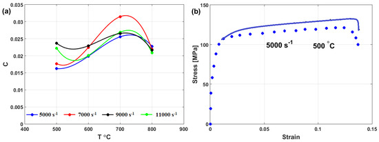 Constant is the slope of the equation, in that it is obtained by plotting vs. . To accurately compute the strain rate sensitivity of coefficient in the JC model, it is recommended that the ratio between every two following strain rates is not less than 0.1 [160], since the exponent, , has to be calculated from the curves of the logarithmic graph of the true stress vs. true plastic strain for different strain rates.