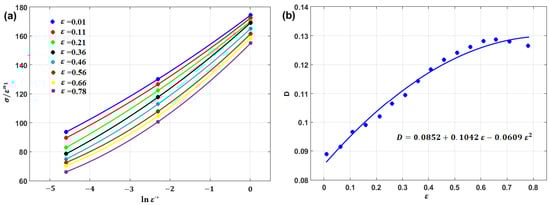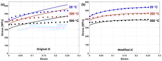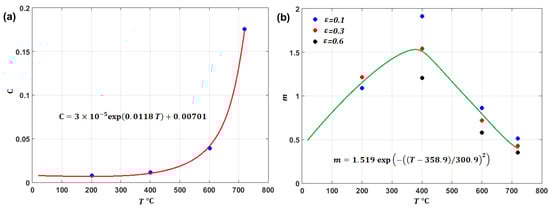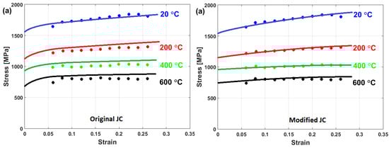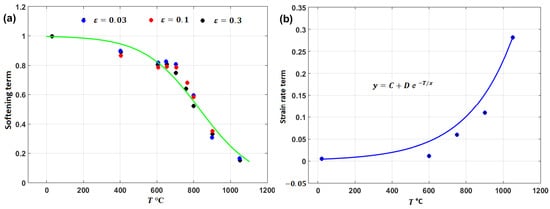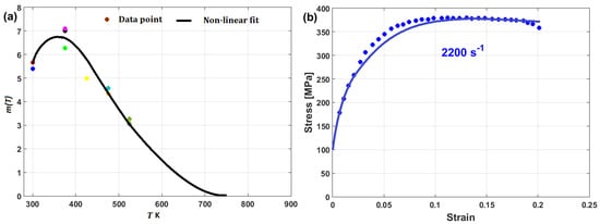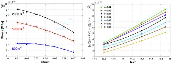 where , and are material constants. The strain rate, , defines a transition between thermally activated and viscous regimes and is stated to have 0.001 s−1 [71]. Constants , and are determined in the same way that was explained for the original JC model (see Section 3.1). At the reference temperature, after performing some rearrangements, Equation (12) can be written as