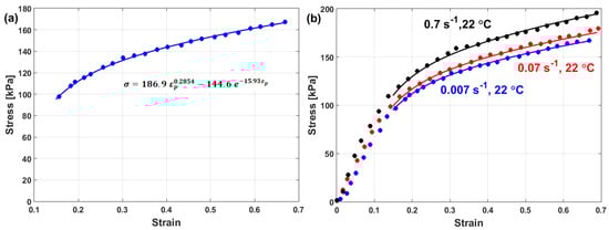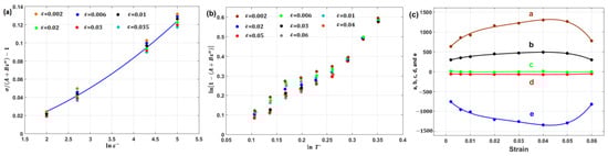 where constants , and are determined by fitting the experimental data of vs. at the reference values with the quadratic function in the strain (cf. Figure 13a). At the reference temperature, Equation (14) lowers to