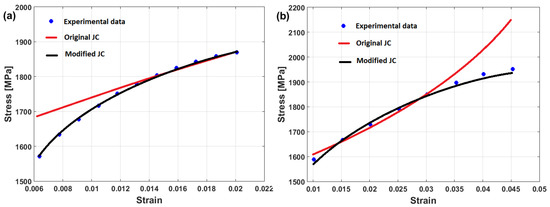 where and are material constants. Constants and are determined in the same way that was explained for the original JC model (see Section 3.1). Taking the logarithm after performing some rearrangements, at different values of the strain rate, Equation (7) can be written as