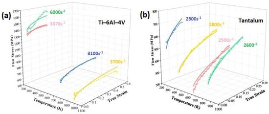 Perez et al. [178] used the modified JC that was introduced by Hou Q. Y. et al. [74] for the prediction of the flow behavior of Ti6Al4V alloy at high temperatures. The modified model succeeded in predicting the flow behavior of the tested titanium alloy with an R of 0.9765 compared with other models. In fact, considering Equation (21), varies with strain, and, hence, Guoliang et al. [179] modified Equation (21) by replacing with , in that has a constant value. Figure 17 shows the regression of both and by plotting vs. and vs. , respectively, which was performed by Guoliang et al. [179].