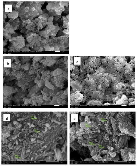 The average particle size of micro and nano Bi2O3 was measured using a transmission electron microscope (TEM) (JEM-2100F, JEOL, Tokyo, Japan) at 200 kV. The average size of the microparticles is 3 µm and that of the nanoparticles is 8 nm, as shown in Figure 1. The cross-sectional morphology and distribution of Bi2O3 within the samples can be obtained by scanning electron microscopy (SEM) (JEOL-JFC-1100E). Figure 2a–e shows SEM images of mortar-prepared samples of CS, CS-mBi2O3 15%, CS-mBi2O3 30%, CS-nBi2O3 15% and CS-nBi2O3 30%. Figure 2d,e shows that nano Bi2O3 particles have a more homogeneous distribution within the samples than micro Bi2O3 particles, which is due to the fact that nanoparticles have a very large surface area-to-volume ratio when compared to the same material in bulk.