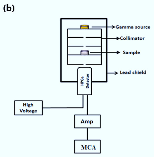 The experiments have been carried out using a cylindrical detector with p-type Hyper Pure Germanium (HPGe) (Model GC1520, Canberra, Australia) with a relative efficiency of 15% in the energy range from 50 keV to 10 MeV [23,24]. Through the narrow beam geometry, the gamma radiation transmittance can be calculated. We used the experimental setup shown in Figure 3, where the detector was surrounded and cylindered by a lead shield with a thickness of 40 mm and a height of 135 mm to minimize background radiation. The distance between the radioactive source and the detector’s surface is 112 mm, ensuring an acceptable narrow beam geometry. Canberra’s ISO 9001 Genie 2000 data acquisition and analysis software, (9233652E V3.0) was used to record and process the measurements, performed using a multichannel analyzer (MCA) to acquire statistically significant peaks in the spectra. The acquisition time was high enough to make the statistical uncertainties less than 1%. Then, the gamma analyzer software automatically calculated the peak area [25].