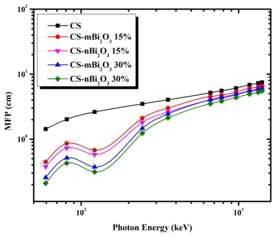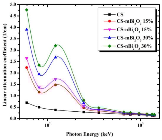 Both methods are in perfect agreement with each other, where the values are varied between 0.03% and 3.96%. The sample composition and the photon energy are two significant factors that influence the mass attenuation coefficients (MAC). Table 4 shows how the percentage of Bi2O3 increases MAC values. To be more specific, the MAC of CS < CS-mBi2O3 15% < CS-mBi2O3 30%. For example, at 0.0595 MeV energy, the MAC values for CS, CS-m Bi2O3 15%, and CS-m Bi2O3 30% are 0.2825 ± 0.0031, 0.8005 ± 0.0018, and 1.3128 ± 0.0024 cm2/g, respectively. Additionally, Table 4 displays the experimental values of the mass attenuation coefficient (MAC) of CS-nBi2O3 15%, and CS-nBi2O3 30% samples. When calculating the relative increase factor which is defined by Equation (14), it is clear that the MAC of the mortar with nano Bi2O3 is higher than that of micro Bi2O3 at all energies.