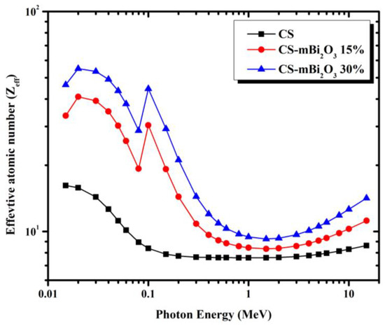 The equivalent atomic number (Zeq) is a parameter that is utilized in the computation of the exposure buildup factor (EBF) and it describes the shielding characteristics of mortar samples in terms of equivalent element. Figure 10 depicts the calculated equivalent atomic number (Zeq) of mortar samples for an energy range of 0.015 to 15 MeV. It is observed that the values of Zeq increase in the middle energy region in the range (0.1 MeV < E < 1 MeV), due to the Compton effect process, but decrease in the low and high energies. Additionally, Figure 10 shows the direct relationship between the Bi content in the samples and Zeq, where the sample CS-mBi2O3 30% has the highest value of Zeq, while the sample CS has the lowest value.