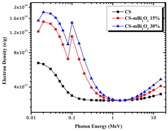 The effective atomic number (Zeff) was also established to appreciate the efficacy of shielding material attenuation capabilities for the prepared mortars. The probability of photoelectric absorption increases with a high effective atomic number. The mortar sample with the highest concentration of Bi2O3 (CS-mBi2O3 30%) showed a steadily increasing linear attenuation coefficient of gamma rays, as shown in Figure 4, due to its association with high Zeff values. Figure 8 depicts the calculated effective atomic number (Zeff) of mortar samples from 0.015 to 15 MeV. Initially, Zeff has comparatively high values and maximum values occur at 0.1 MeV for the mortars with Bi2O3 contents., because of the K-absorption of Bi. As energy increases up to 1 MeV, Zeff drops dramatically to minimum values, indicating that the Compton scattering process takes over. Due to the dominance of the pair creation process in the high energy region, the values of Zeff increased slowly with energy. Figure 9 shows the electron density (Neff) curves for the mortar samples, which exhibit behavior that is quite similar to that of the Zeff curves.