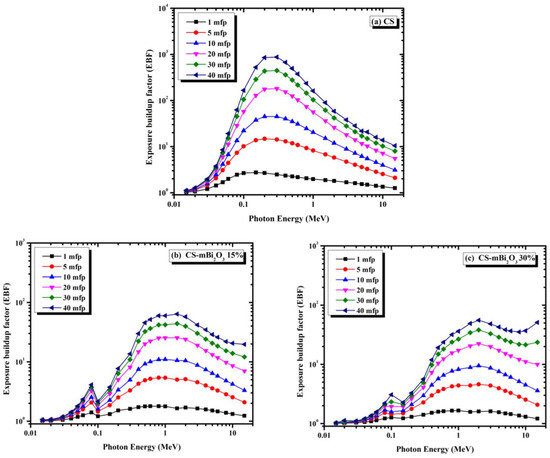 Figure 11a–c shows how the exposure build-up factor (EBF) varies with photon energy for penetration depths of up to 40 mfp for the samples CS, CS-mBi2O3, and CS-mBi2O3. EBF typically increases as the penetrating depth increases; however, the impact was variable and was reported to be energy dependent. The abundance of the photoelectric effect is represented by the lowest EBF values at low energy levels (0.1 MeV), and the K-absorption edge of Bi is attributed to a sharp peak at 0.09 MeV (this peak was observed in samples of CS-m Bi2O3 15% and CS-m Bi2O3 30%). In the intermediate energy range (0.1 to 10 MeV), EBF rises with energy and reaches its maximum value at 1.5 MeV, which is predicted due to the likelihood of the Compton scattering effect. At very high energies (more than 10 MeV), due to the pair production event, the values tended to steadily rise as incident energy increased. The probability of pair production increases with photon energy and atomic number. Consequently, numerous scattering events cause a buildup of secondary gamma photons produced by electron-positron annihilation in the medium. Additionally, the increased thickness of the interacting material as a result of the increased penetration depth of the materials causes an increase in scattering events in the interacting medium, particularly for the material with the greatest equivalent atomic number. As a result, the EBF values are high [36].