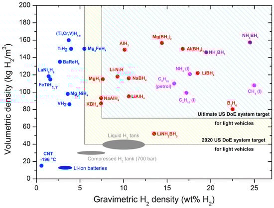Overview of different hydrogen storage systems and their volumetric and gravimetric hydrogen density. The U.S. Department of Energy targets for the hydrogen storage system are also shown for comparison. Copyright 2017, Elsevier. Reproduced with permission from [7].