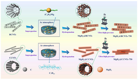 Schematic illustration of the self-assembly of MgH2 NPs on the BCNTs and CCNTs by impregnation and hydrogenation and densification under ultra-high pressure of 750 MPa. Copyright 2019, Elsevier. Reproduced with permission from [55].