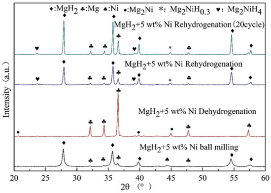 XRD patterns after ball milling, the hydrogen dehydrogenation, rehydrogenation and after the 20th cycle for MgH2 + 5 wt.% Ni. Copyright 2021, The Royal Society of Chemistry. Reproduced with permission from [64].