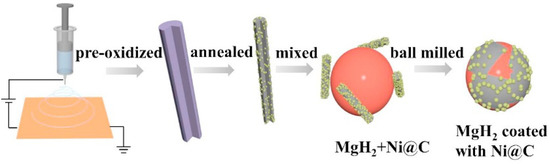 The multiple elements contained in Ni-based alloys and Ni-based compounds usually contribute to the improved kinetic performance of Mg/MgH2; however, the defects of Mg/MgH2 in cyclic performance gradually emerge. Scholars have found that the use of carbon materials to support nickel-based catalysts not only helps to further improve the kinetic performance of Mg/MgH2, but also enhances the stability of Mg/MgH2 during cycling. Recently, Meng et al. [74] introduced an electrospinning-based reduction method to generate nickel nanoparticles in situ in carbon nanofibers and investigated the catalytic effect of this composite (Ni@C) on the hydrogen storage performance of MgH2. Figure 4 shows the brief synthesis steps of Ni@C. It was shown that the nickel nanoparticles were protected from irreversible fusion and aggregation in subsequent high-temperature pyrolysis because of the presence of carbon nanofibers, leading to the excellent kinetic and cycling performance of MgH2. Later, Duan et al. [75] and Hou et al. [76] investigated the catalytic performance of carbon nanotube-supported nickel (CNTs-Ni) and biomass charcoal material-supported nickel (Ni/BC) for MgH2, respectively. The study reconfirmed that the introduction of carbon materials was a better choice for improving the hydrogen storage performance of MgH2. In fact, Zeng et al. [77] and Hou et al. [73] also focused on the catalytic performance of carbon-supported Ni3S2 and NiMoO4, respectively. Zeng et al. [77] found that the introduction of carbon provided additional catalysis for Mg/MgH2 on top of Mg2Ni and MgS. To some extent, the catalytic performance of Ni3S2@C was superior to that of Ni3S2. Hou et al. [73] showed that the introduction of rGO on top of Mg2Ni and Mo effectively inhibited the growth and agglomeration of Mg/MgH2 particles during hydrogen absorption and desorption, thus promoting their cyclic stability. Figure 5 shows the synergistic catalytic mechanism of rGO and NiMoO4 for Mg/MgH2 particles. Carbon-supported nickel-based catalysts not only provide more active catalytic substances to promote the kinetic properties of Mg/MgH2, but also enhance the cycling performance of Mg/MgH2 by the unique properties of carbon materials.