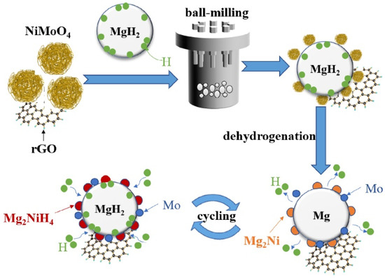 Schematic diagram of the action mechanism of NiMoO4 and rGO co-catalyzing MgH2 particles. Copyright 2022, Elsevier. Reproduced with permission from [73].