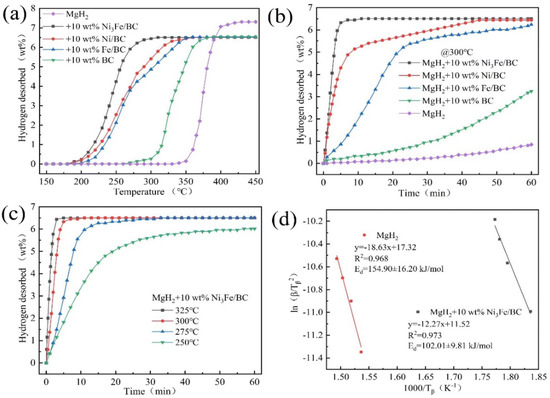 Rising temperature dehydrogenation (a) and isothermal dehydrogenation (b) curves of pure MgH2 and MgH2 with 10 wt.% of different catalyst samples, isothermal dehydrogenation curves of MgH2 + 10 wt.% Ni3Fe/BC composites at different temperatures (c), and Kissinger plots of MgH2 and MgH2 + 10 wt.% Ni3Fe/BC (d). Copyright 2022, Royal Society of Chemistry. Reproduced with permission from [91].