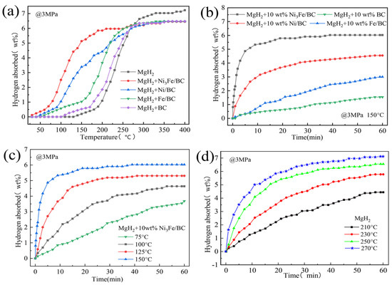 Isothermal hydrogen uptake curves of pure MgH2 and MgH2 with 10 wt.% of different catalyst samples (a), isothermal hydrogen uptake curves of MgH2 with 10 wt.% of different catalyst samples under 3 MPa H2 pressure at 150 °C (b), isothermal hydrogen uptake curves of MgH2 + 10 wt.% Ni3Fe/BC composite (c) and MgH2 (d) at different temperatures. Copyright 2022, Royal Society of Chemistry. Reproduced with permission from [91].