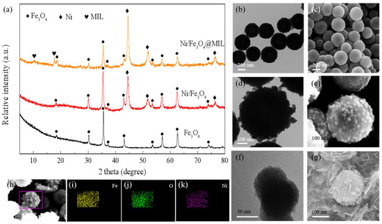 (a) XRD patterns of the Fe3O4, Ni/Fe3O4 and Ni/Fe3O4@MIL. TEM and SEM images of Fe3O4 (b,c), Ni/Fe3O4 (d,e) and Ni/Fe3O4@MIL (f,g). EDS mapping of the elemental distribution of (i) Fe, (j) O and (k) Ni corresponding to (h) Ni/Fe3O4. Copyright 2022, Elsevier. Reproduced with permission from [92].