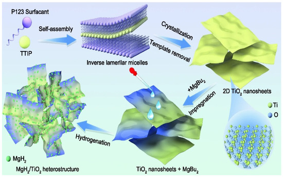 Synthesis process illustration of the MgH2/TiO2 heterostructure. Copyright 2022, Springer Singapore. Reproduced with permission from [114].