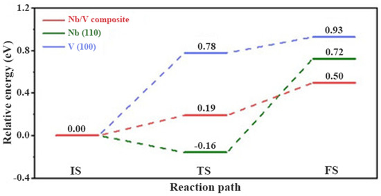 Calculated energy profiles for the H2 desorption of MgH2 on V (100), Nb (110) and Nb/V composites, respectively. Copyright 2022, Wiley Online Library. Reproduced with permission from [127].
